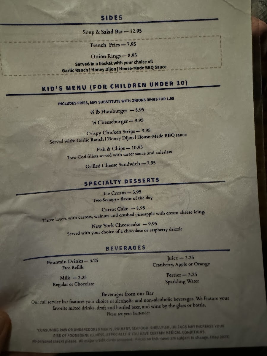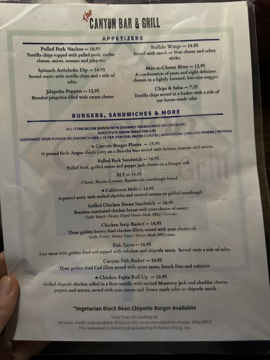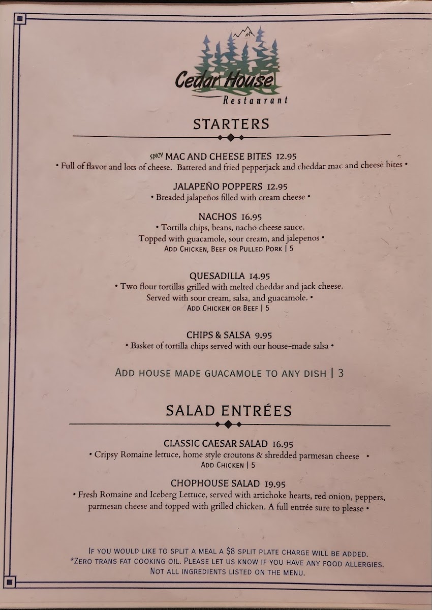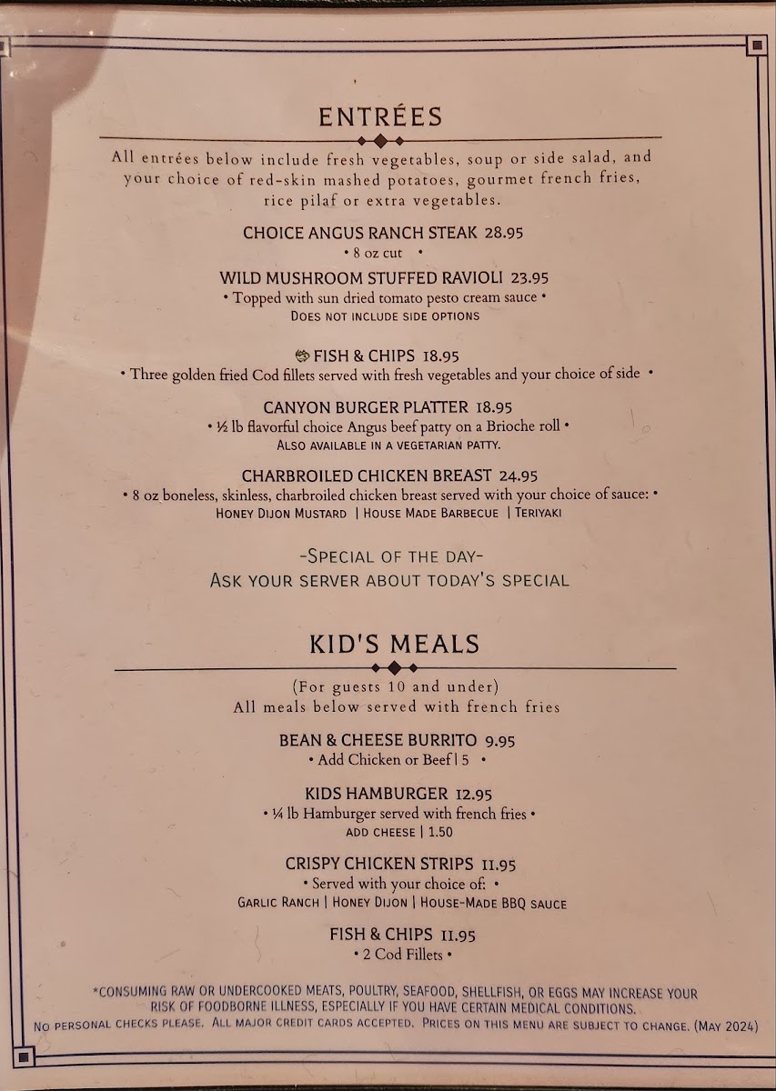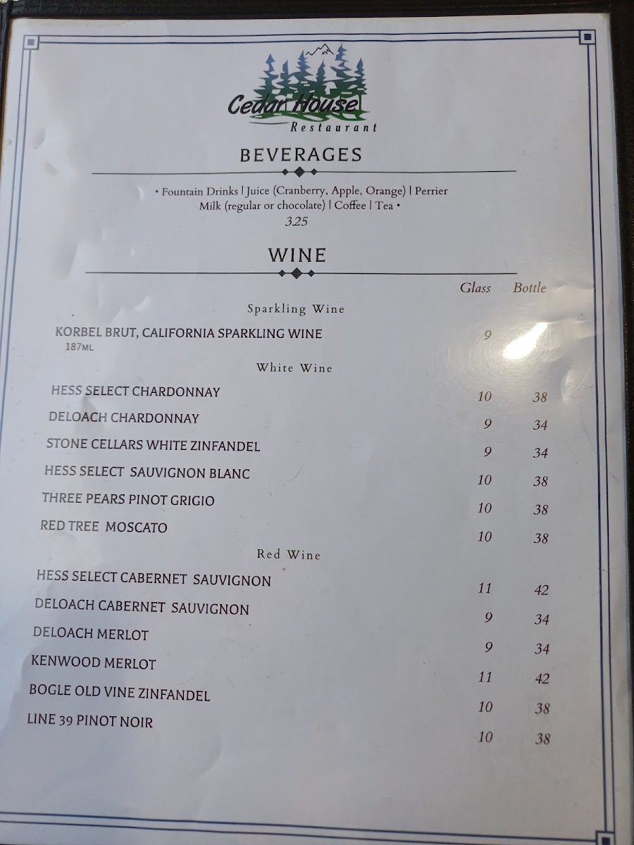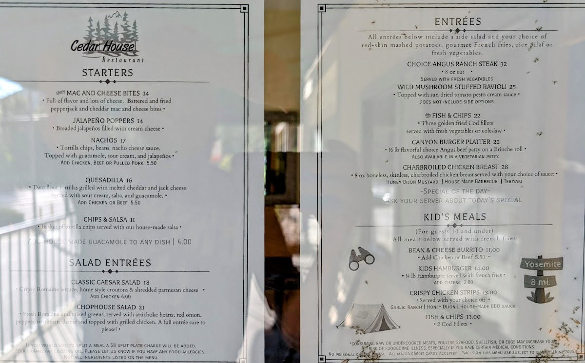 The menu at Cedar House Restaurant in El Portal offers a versatile range of options that cater to both casual diners and those seeking a more indulgent meal. Breakfast enthusiasts will find items like the Egg, Ham & Cheese Croissant, Egg, Sausage & Cheese Biscuit, Egg, Bacon & Cheese Biscuit, and the Spinach, Egg & Cheese Wrap, complemented by Assorted Muffins for a lighter start. The Canyon Grill section features hearty Starters such as Pulled Pork Nachos, Spinach Artichoke Dip, Mac-N-Cheese Bites, and Buffalo Wings, while Entrees include the satisfying Canyon Burger Platter, Pulled Pork Sandwich, BLTCalifornia Melt, and Grilled Chicken Breast Sandwich, all of which can be paired with Sides A La Carte like French Fries, Onion Rings, or Coleslaw. Sweet finishes are available with Ice Bream, Carrot Cake, and New York Cheesecake. For younger guests, the Kids Menu offers familiar comforts such as Kids Crispy Chicken Strips, Kids Fish And Chips, Kids Grilled Cheese, and Kids 1/4 Hamburger or Cheeseburger. Beverage selections are extensive, from CC Coffee and Hot Chocolate to draft and bottled beers, including 1850 Dark Horse and Blue Moon, alongside wines by the glass or bottle such as Brady Cabernet Sauvignon and Balletto Chardonnay, and a sparkling House Prosecco. The spirits menu covers all bases, featuring Brandy-Cognac, Gin, Rum, Tequila, Vodka, and more, ensuring there’s something for every palate. Overall, the menu balances classic comfort foods with refined options, making it suitable for families, casual lunch-goers, or those enjoying a leisurely dinner with drinks.
